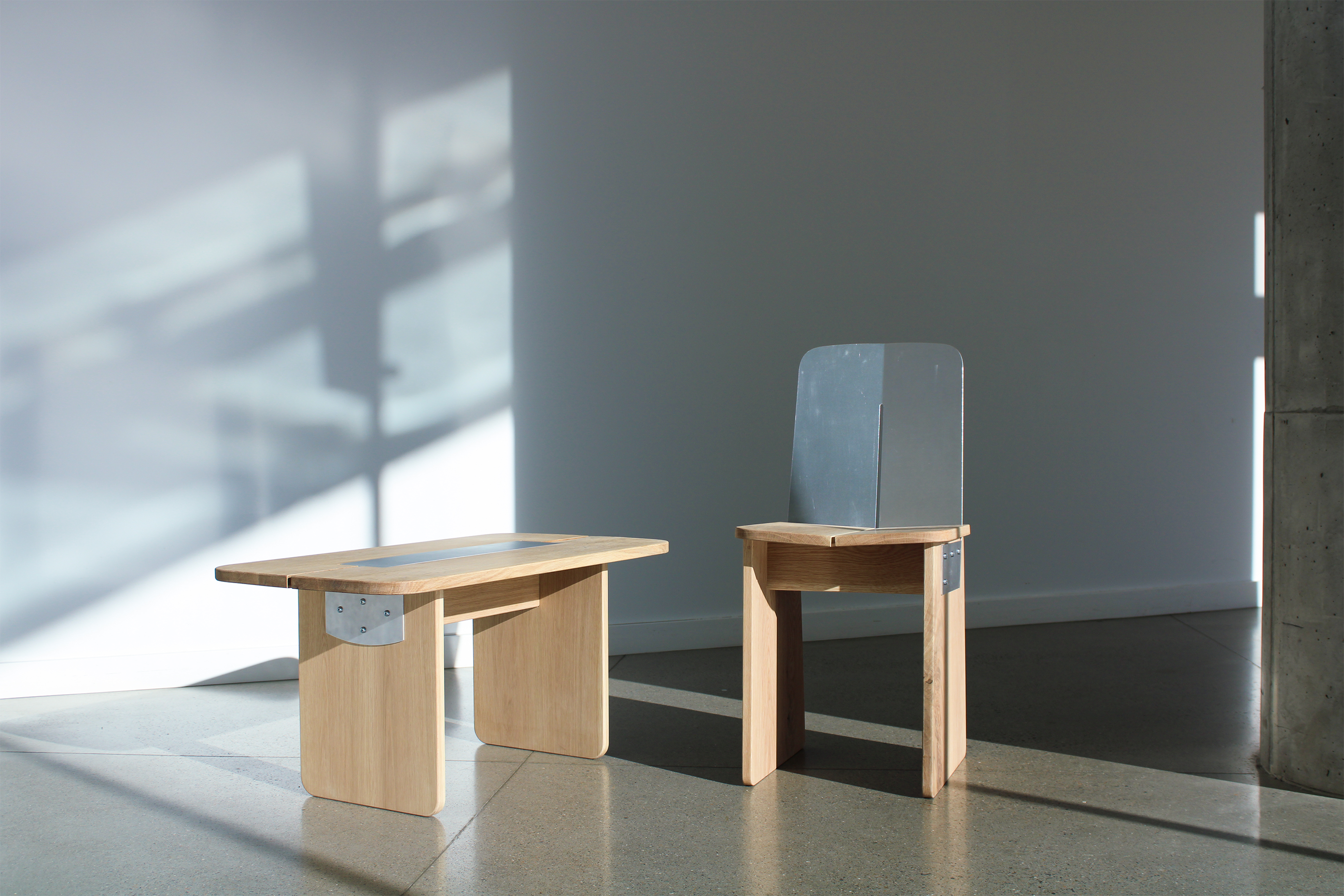 The metal running across the table-top is visually distinct without sacrificing utility, being sand-blasted and steel-wool-ed for a finish more forgiving to scratches. The chair's backing is sturdy but with a slight give, highlighting the material affordances of the sheet metal.