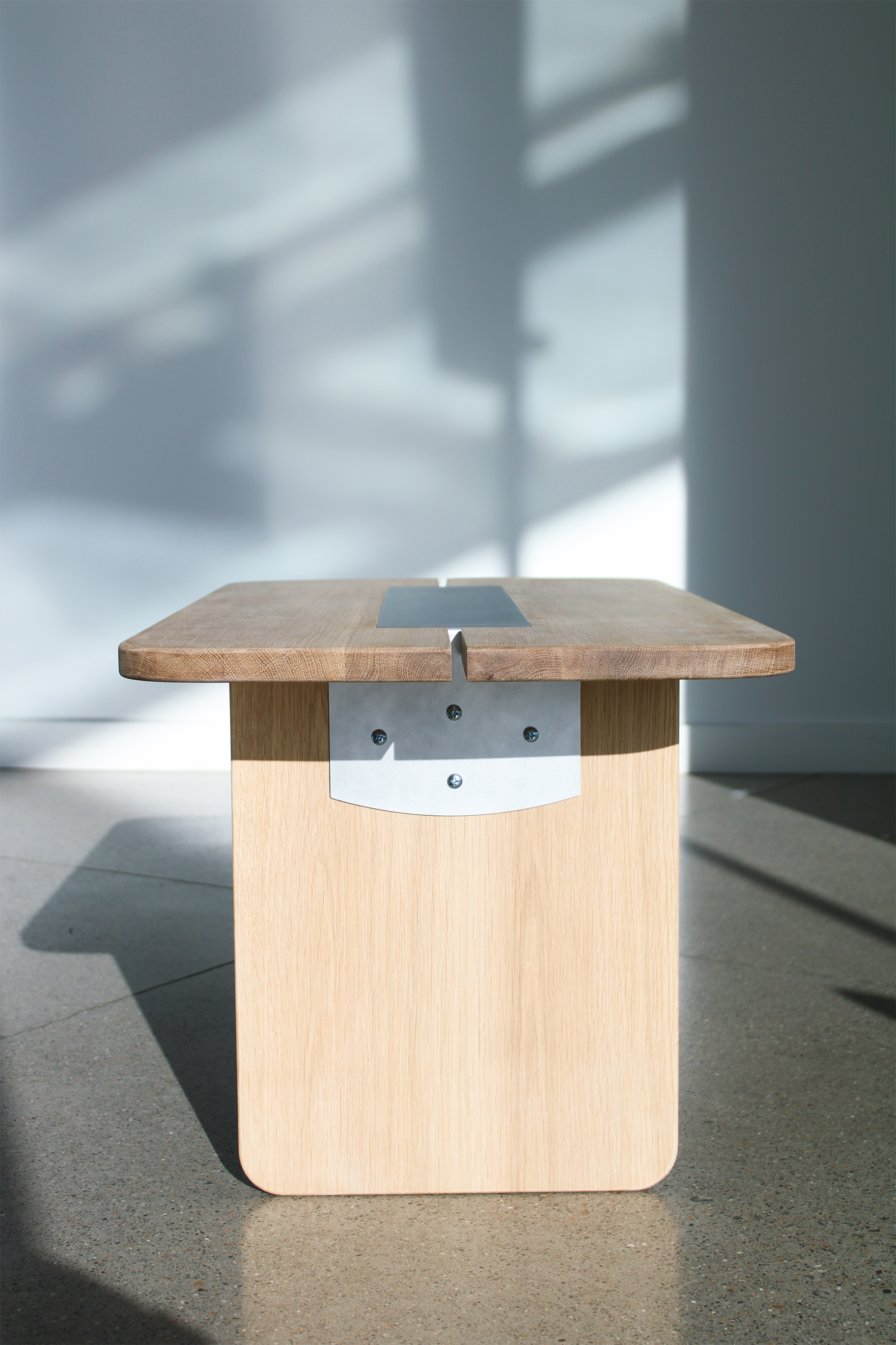 Hand-crafted from white oak, each is held in place by a single piece of bent sheet 5052 aluminum, acting as the aesthetic and structural cornerstone of the object. They can be flat-packed and assembled with a screwdriver in under 5 minutes.